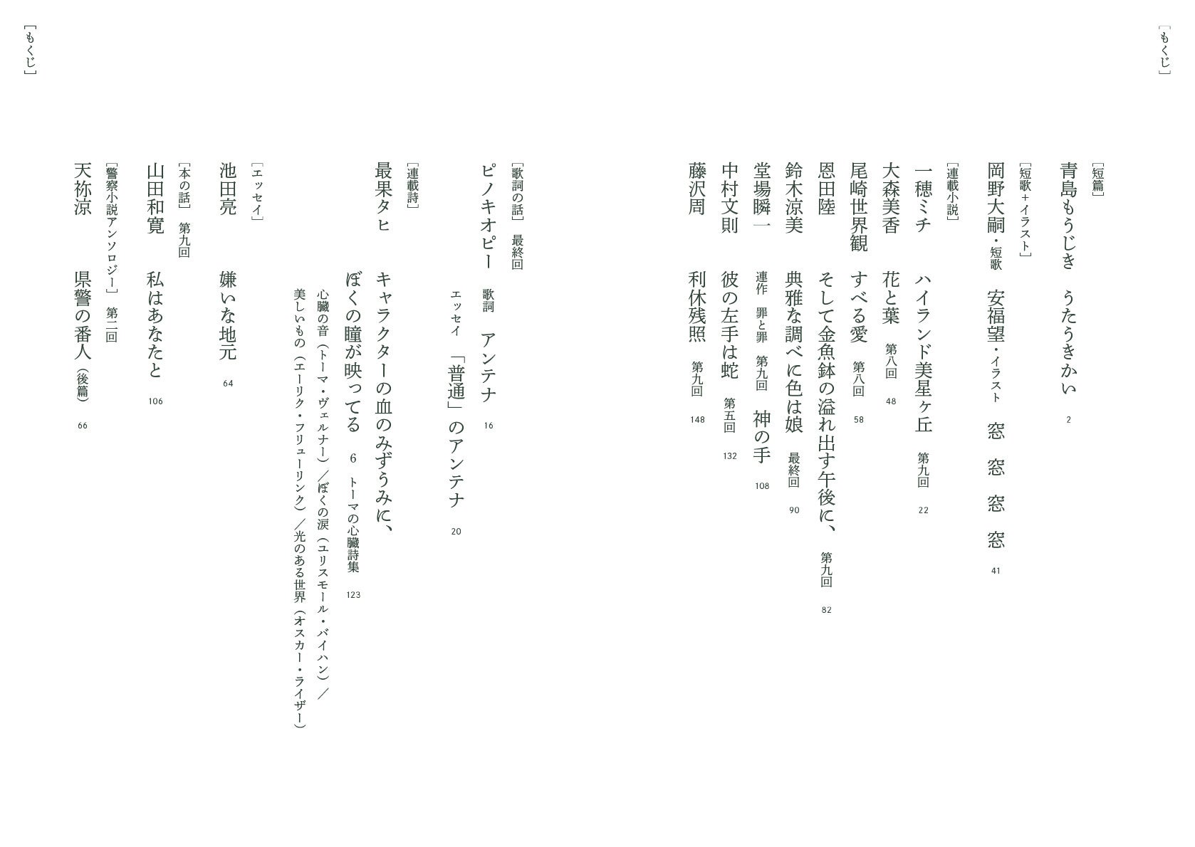 エッセイは岸田國士戯曲賞を受賞した池田亮さんが登場。「本の話」は装丁家・書体デザイナーの山田和寛さんにご寄稿いただきました。