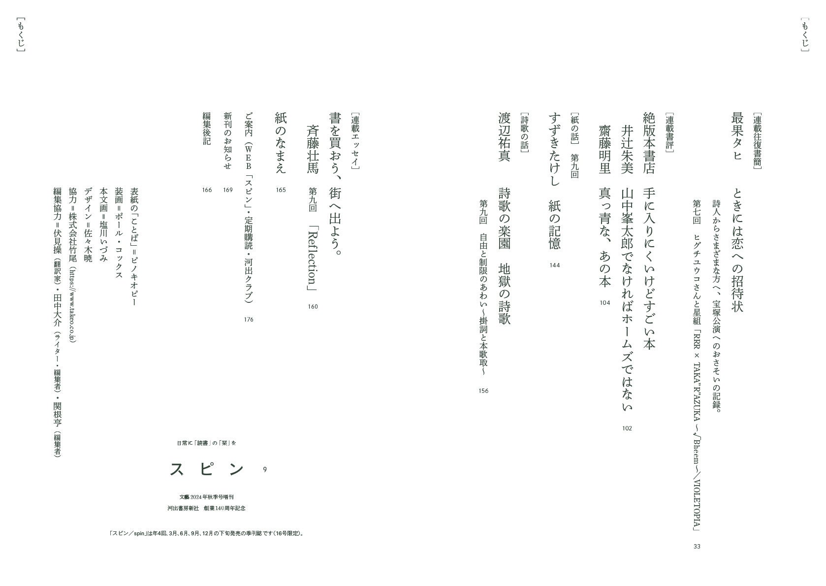 さらに斉藤壮馬さんの異色の連載エッセイ「書を買おう、街へ出よう。」、書評家・ゲーム作家の渡辺祐真さんの連載「詩歌の話」に加えて、好評連載書評「絶版本書店 手に入りにくいけどすごい本」では井辻朱美さん(白百合女子大学教授・ファンタジー文学)、齋藤明里さん(女優)が「絶版本」への熱い思いを語ります。